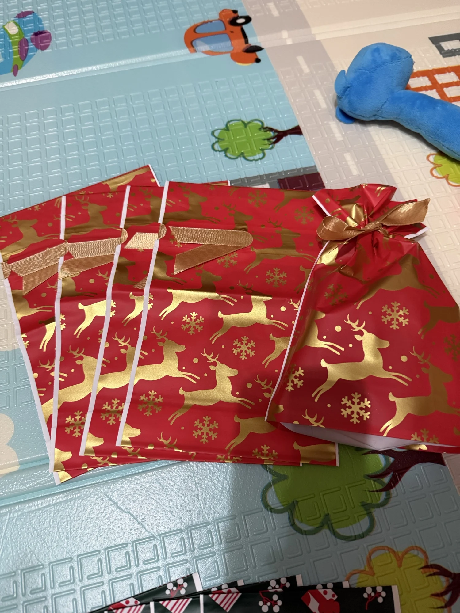 - Christmas-themed drawstring gift bags in multiple sizes